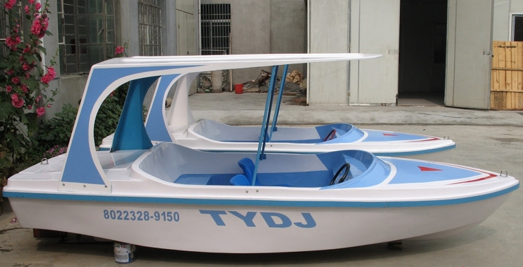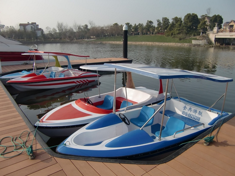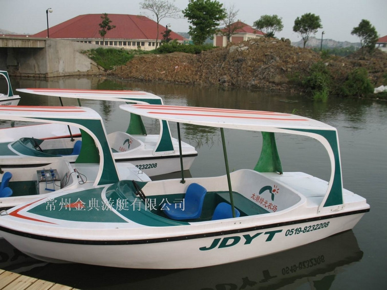 船體材質(zhì)玻璃鋼,具有強(qiáng)度高、重量輕、耐腐蝕、不怕日曬雨淋、色彩艷麗、外型美觀的特點(diǎn)。電瓶驅(qū)動(dòng),沒有污染,可由游客自行駕駛??晒┕珗@水域、湖泊、水庫、水上游樂。
